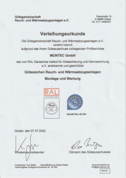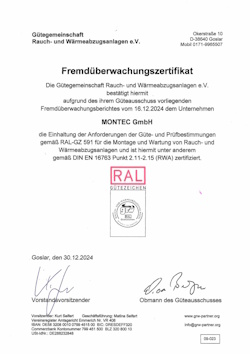 Zur Qualitätssicherung stellt sich die MONTEC GmbH freiwillig den regelmäßigen Überprüfungen unabhängiger Zertifizierungsinstitutionen. Die MONTEC GmbH hat eine Zuliefererzertifizierung für den Austausch von pyrotechnischen RWA-Treibsätzen für das RWA-System Greschalux SmokeEx Rasant.