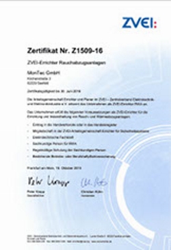 Unsere Mitarbeiter sind durch den Zentralverband der Elektroindustrie (ZVEI) und den Technischen Überwachungsverein Bayern (TÜV Bayern) zertifizierte Sachkundige für RWA, Feststellanlagen, kraftbetätigte Türen und Fenster sowie Brandschutztüren.